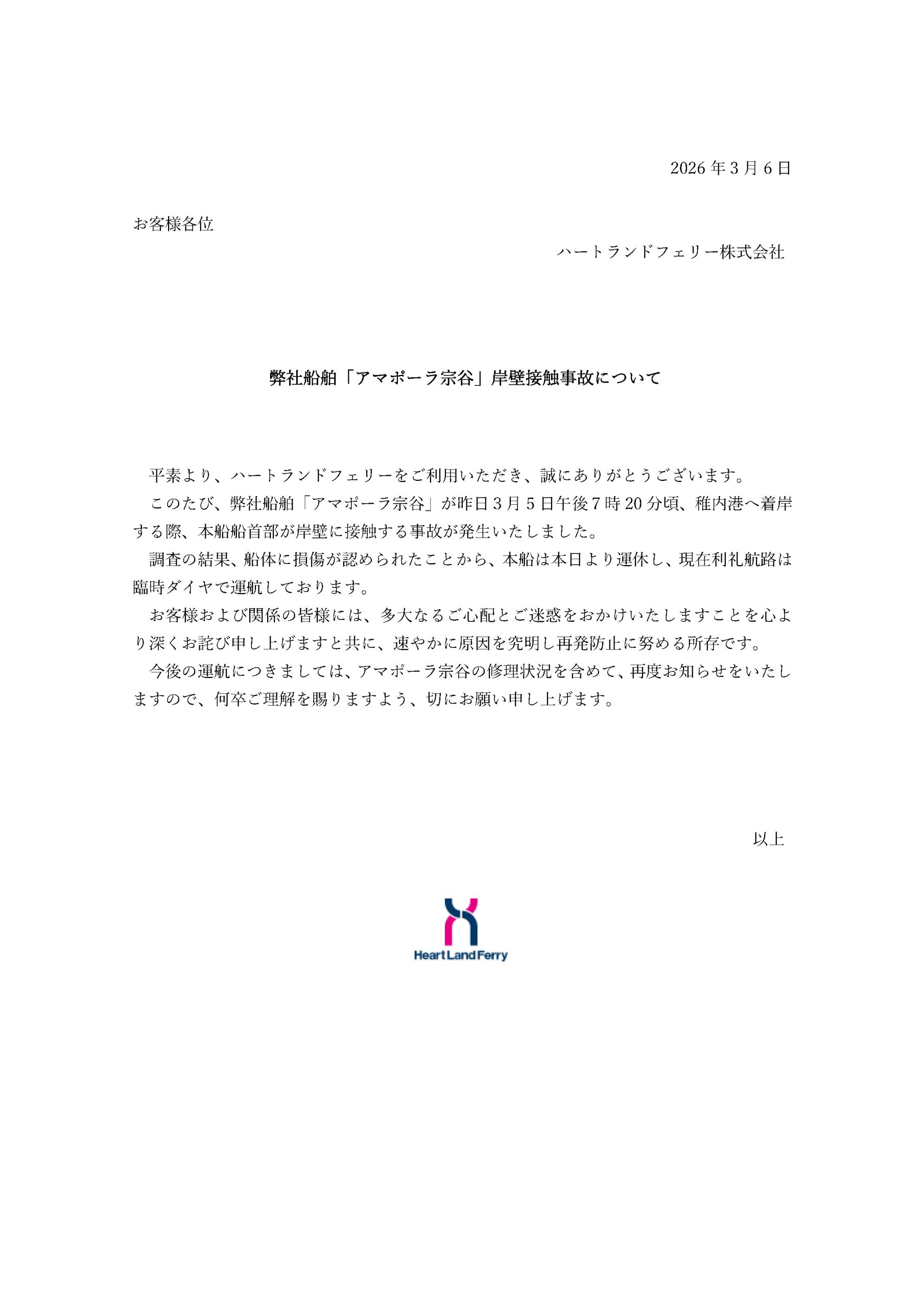 平素より、ハートランドフェリーをご利用いただき、誠にありがとうございます。