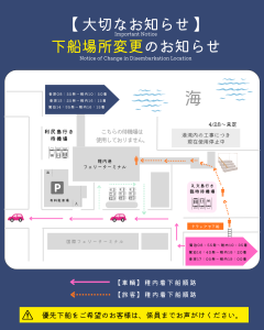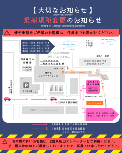 現在、岸壁工事に伴い乗下船場所及び待機場も変更しておりますが、2026年4月28日(火)からのダイヤ変更に伴い、乗下船場所のご案内をいたします。